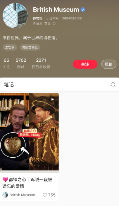 近日,有网友发文称,英国大英博物馆在小红书开通账号并发布首条入驻视频。据查询,该账号名称为British Museum,身份认证为博物馆,账号简介为“来自世界股票配资公司平台,属于世界的博物馆”,账号目前拥有5702名粉丝。